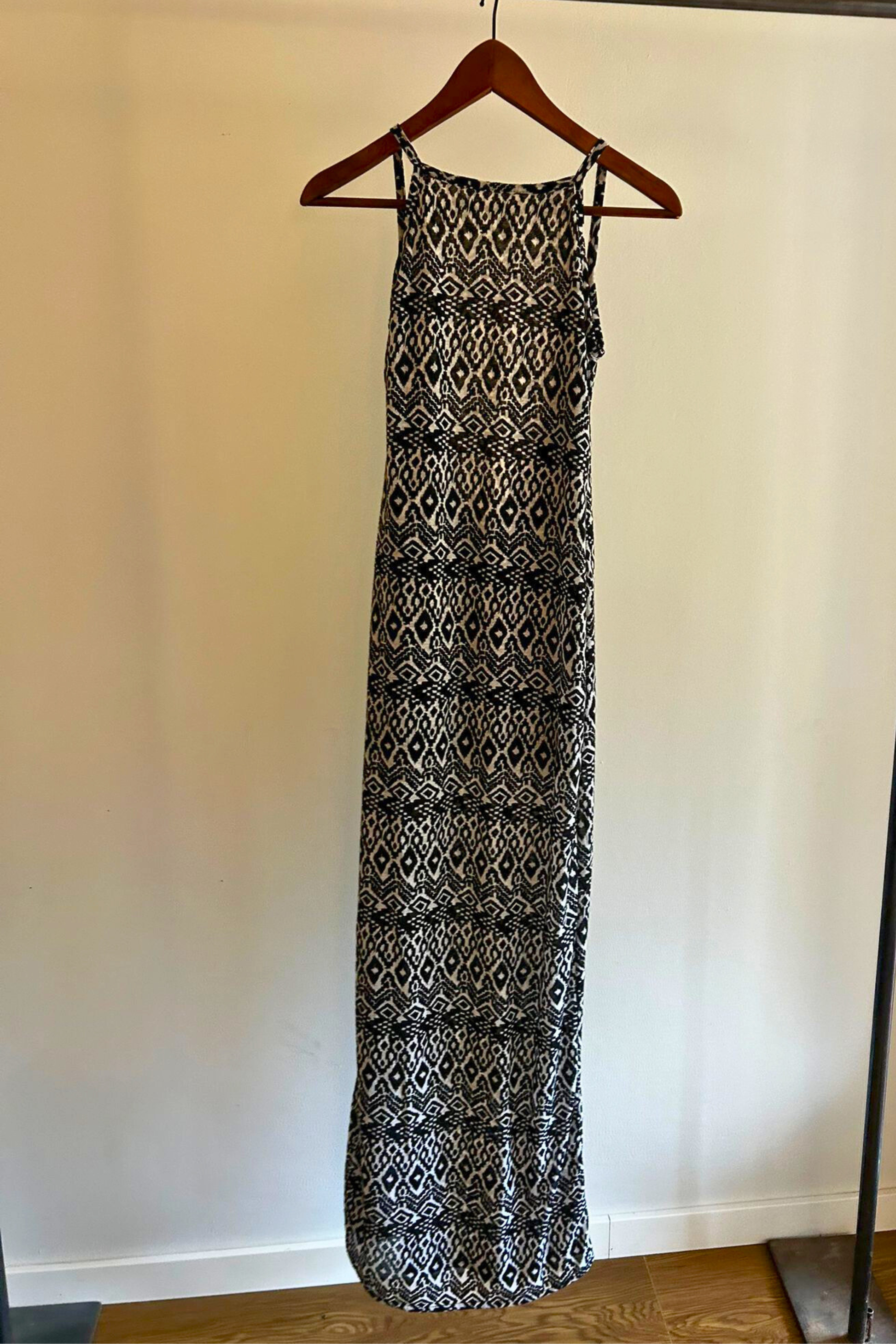Afrodita Africa es una de las versiones del patrón Afrodita. El estampado geométrico, inspirado en motivos africanos, crea un juego hipnótico en blanco y negro que potencia la silueta y aporta una presencia poderosa.