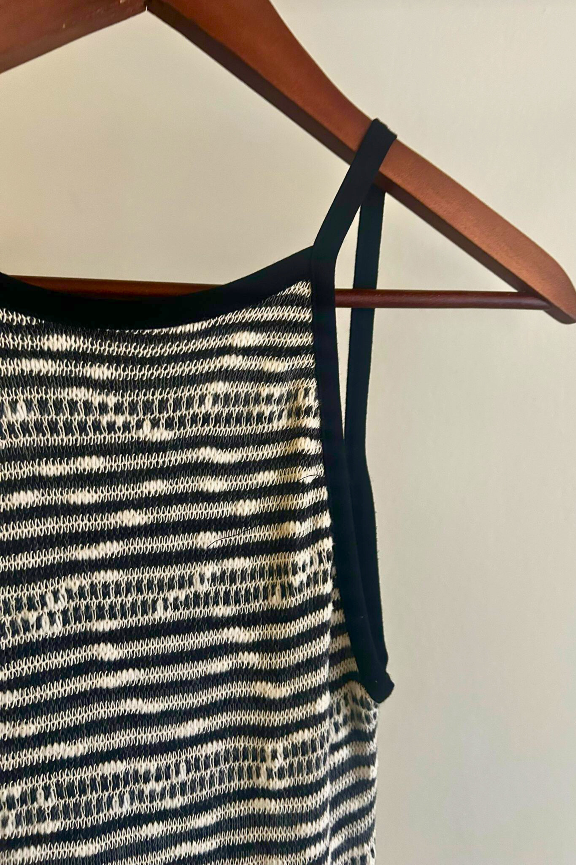 Afrodita Tricot es una versión más textural y envolvente del patrón Afrodita. El tejido de punto fino, con rayas irregulares en blanco y negro, crea un efecto visual orgánico que acompaña el cuerpo con naturalidad.