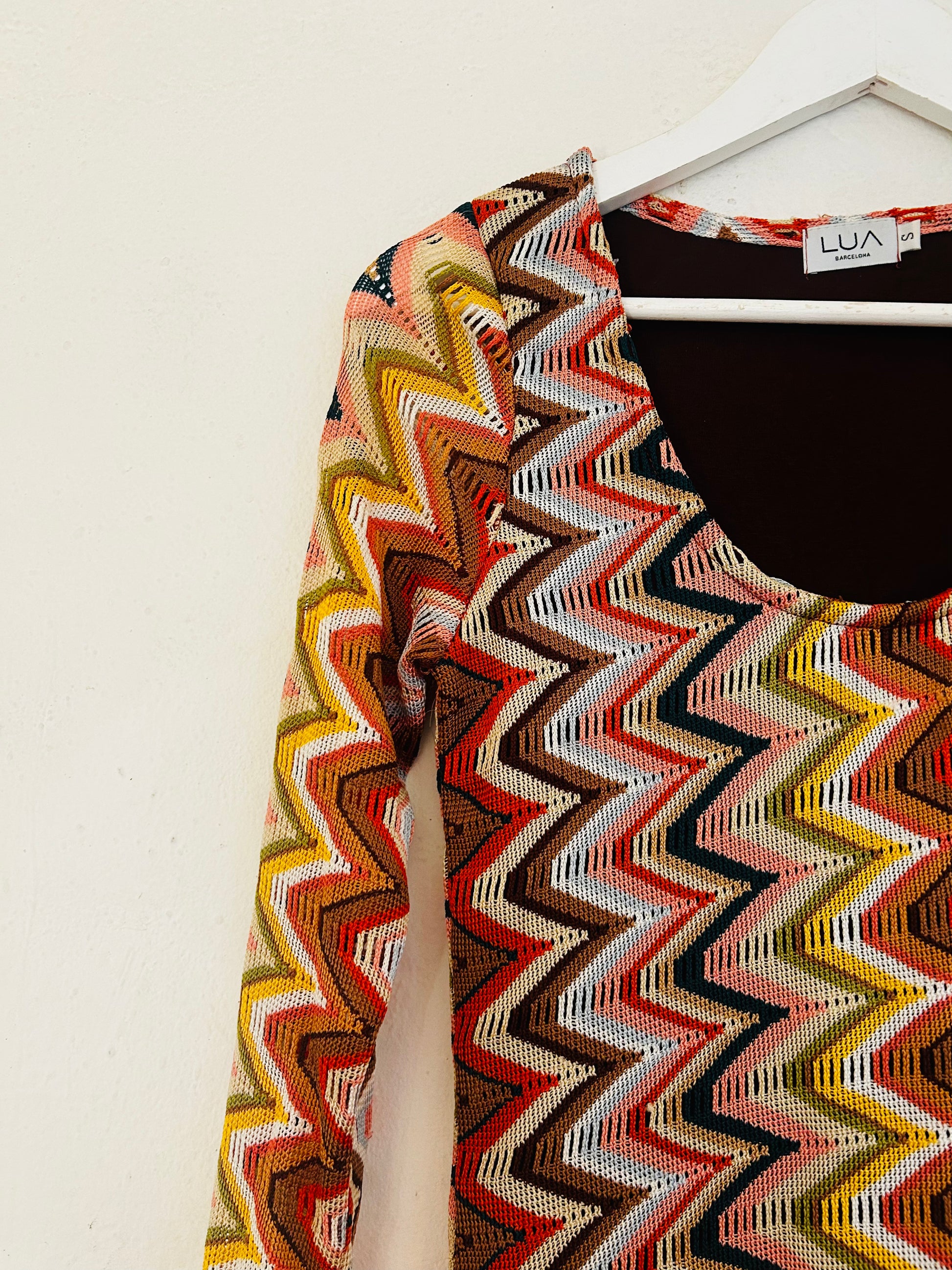 Vestido Hera Colours corto es una pieza vibrante y llena de carácter. Su estampado en zigzag multicolor combina tonos tierra, rojos, mostaza y matices más suaves en un juego visual dinámico que estiliza la silueta y aporta energía a cada movimiento.