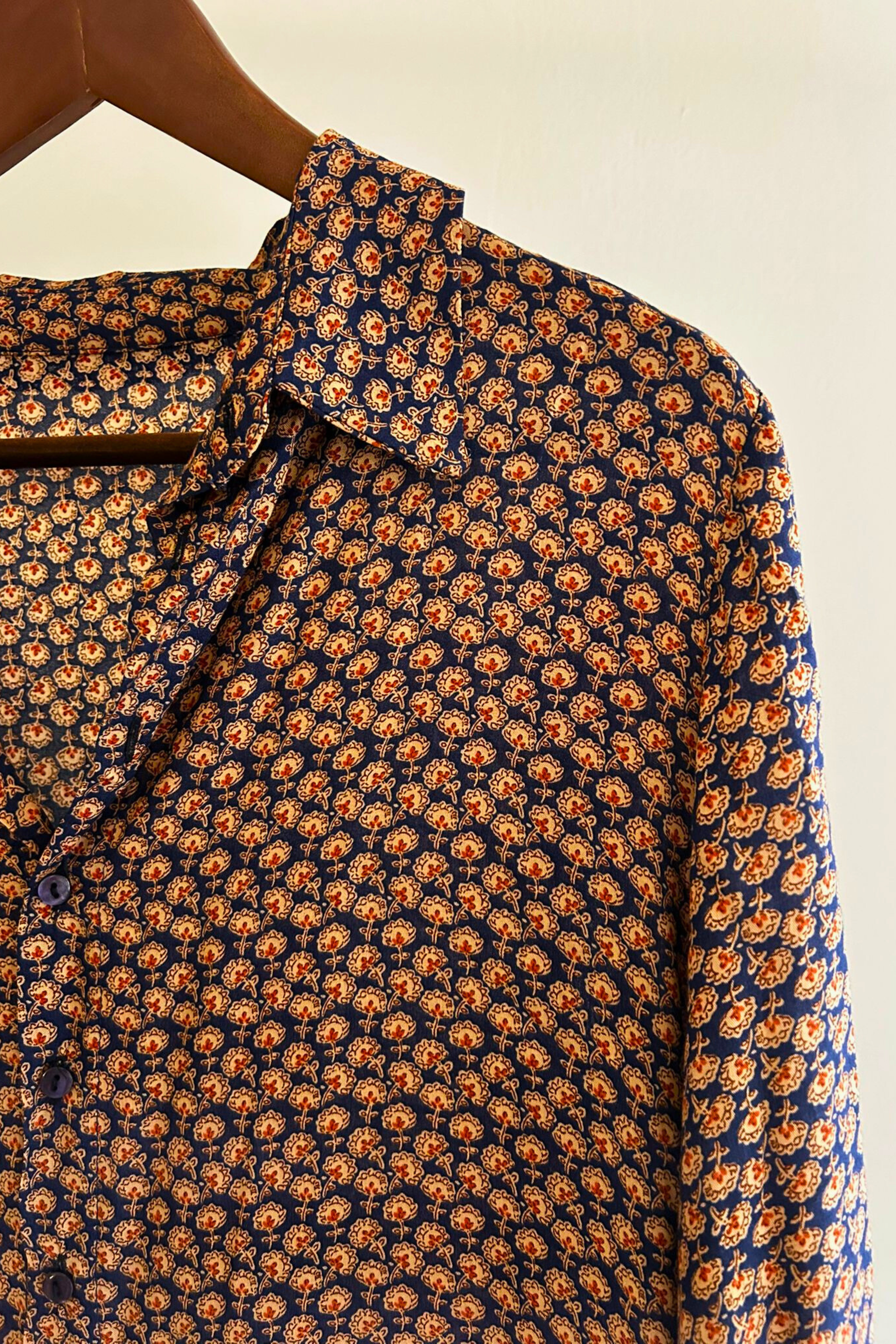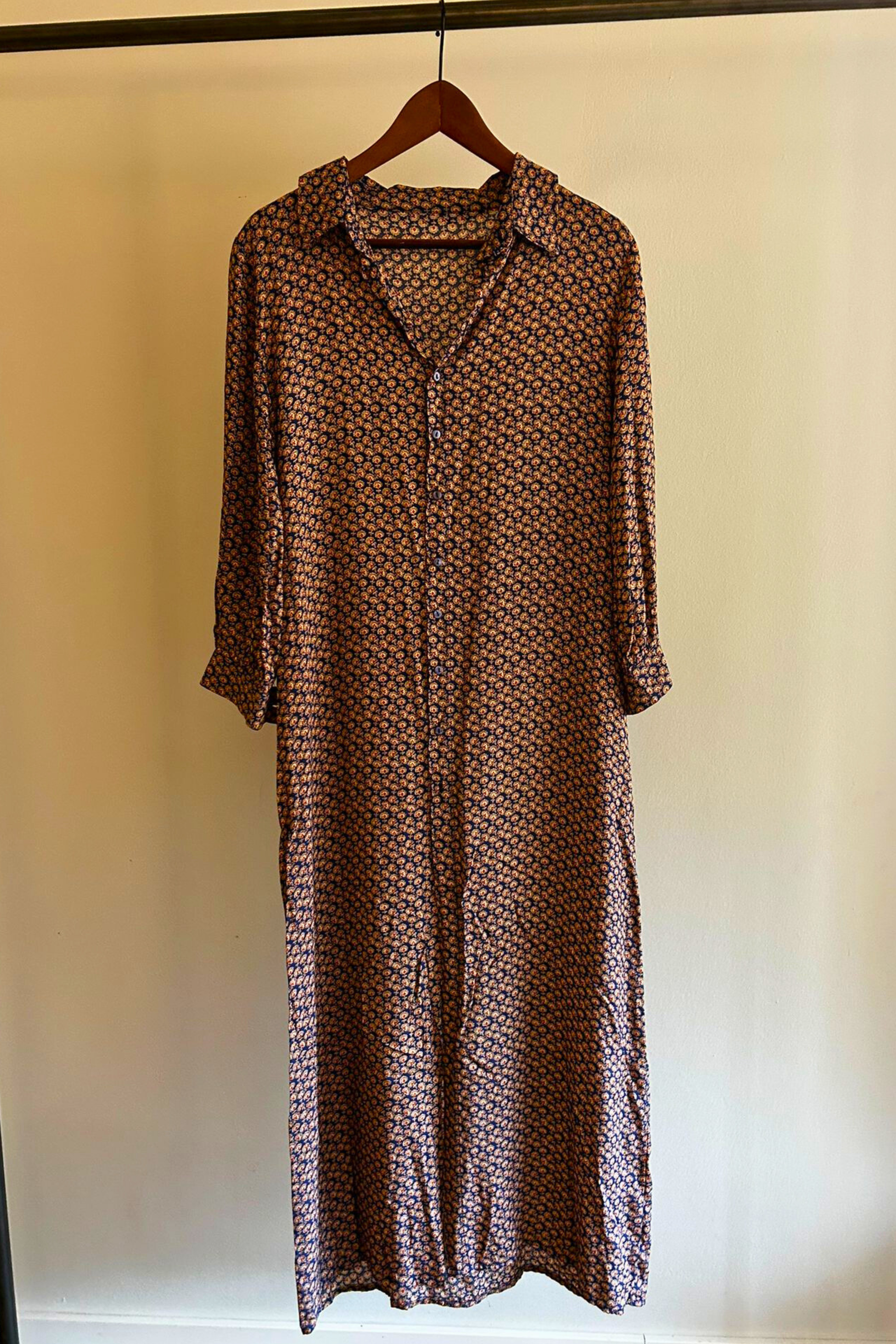 El Camisero Blue Print es una de esas piezas que funcionan siempre. Su silueta relajada, el corte camisero clásico y el estampado repetido de inspiración artesanal lo convierten en un vestido fácil, elegante y muy versátil.